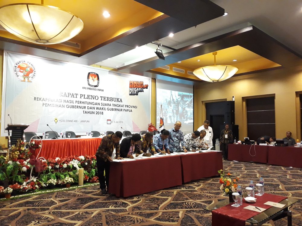 Jayapura(KPN)- Pantauan Kabar Pornumbay di lapangan dari Rapat Pleno Terbuka Rekapitulasi hasil penghitungan suara pemilihan Gubernur dan Wakil Gubernur Provinsi Papua Tahun 2018, berlangsung di Lantai 7 Ruang Victory Grand Abe Hotel, Distrik Abepura,yang gelar selama 2 hari yaitu 8 hingga 9 Juli 2018