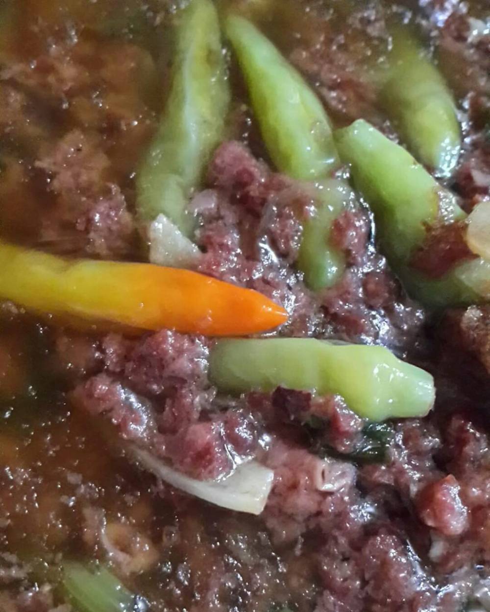 - tunggu 3-5 menit, lalu masukkan cabai rawit segar, aduk lagi dan tunggu hingga cabai agak layu