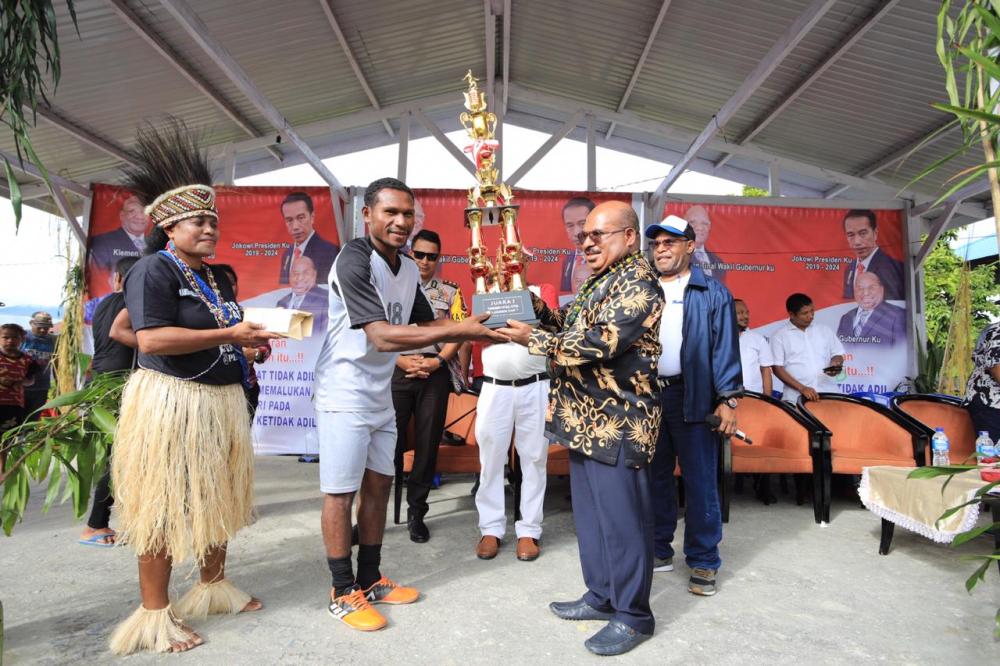 Selain menyerahkan piala, dalam kesempatan itu juga Gubernur Enembe mensosialisasikan pelaksanaan Pekan Olahraga Nasional (PON) XX 2020 kepada masyarakat di Kampung Babrongko.