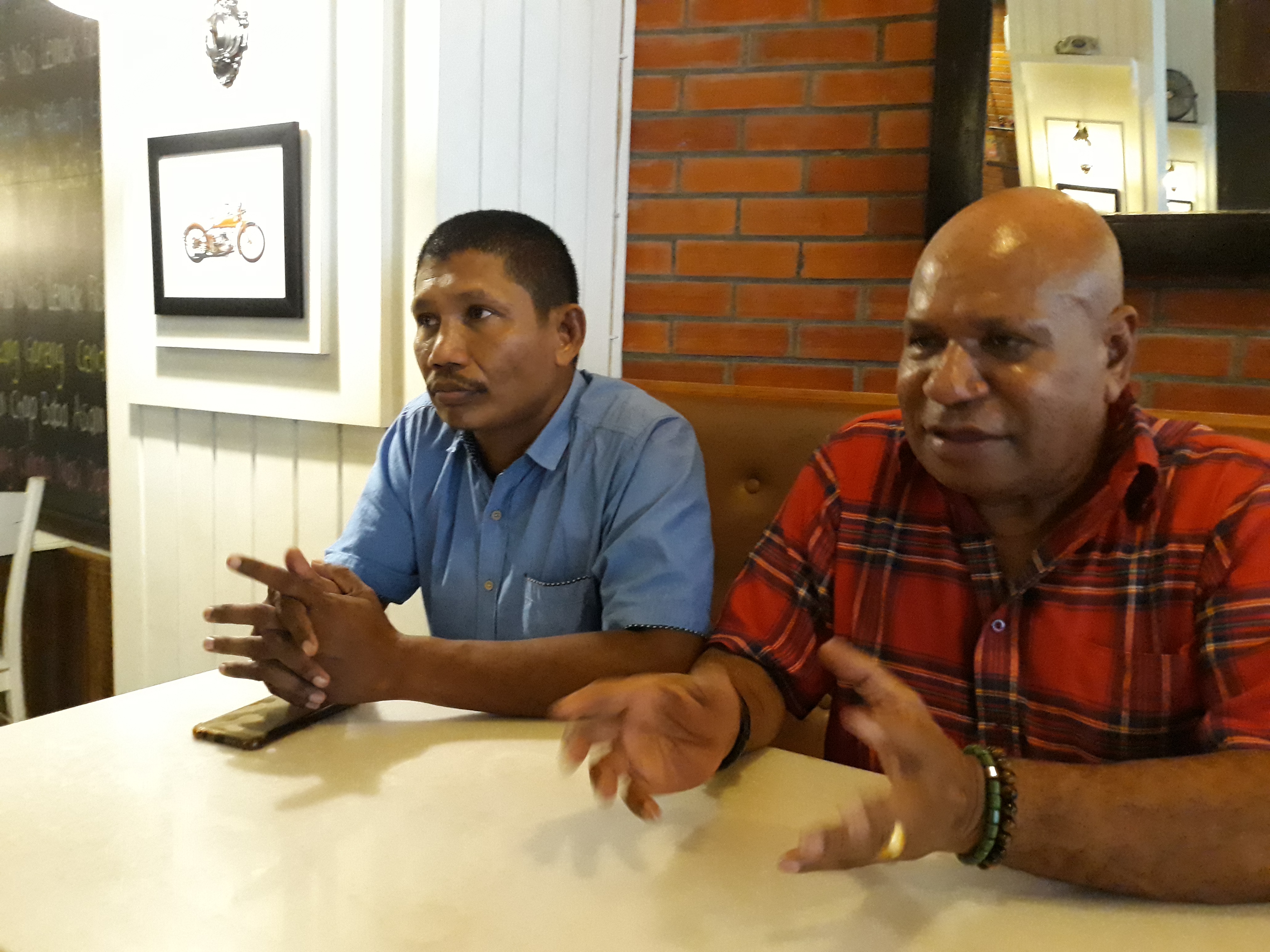 Ketua relawan papua bungkus Ramses Wally yang di dampingi oleh sekretaris Husni Disfinubun, dan anggota saat menggelar konferensi pres di salah satu cafe di wilayah Abepura, Rabu (14/11/2018).