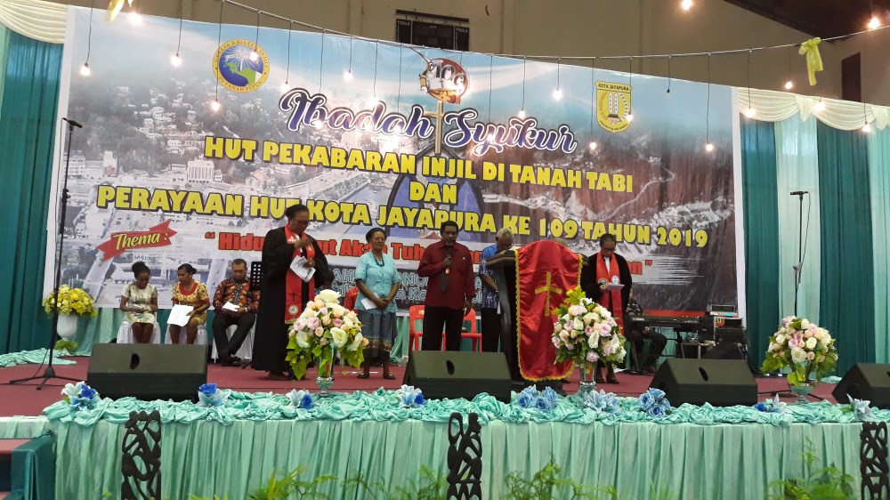 Jayapura ( KPN)- Melalui Hut Kota Jayapura dan Hut Pekabaran Injil ( PI) di Tanah Tabi yang ke- 109 , kita wujudkan kehidupan masyarakat yang takut akan Tuhan dan peduli lingkungan ,menjadi sorotan sub thema dalam Ibadah syukur Kota Jayapura dan Pekabaran Injil di Tanah Tabi yang dilangsungkan di GOR Waringin Kotaraja , Minggu (10/03/2019).