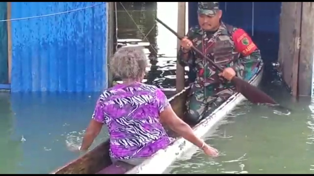 Dikatanya Serka Supriyadi Anggota Babinsa Ramil 1701-01/ Sentani bergegas melakukan proses evakuasi dengan menggunakan perahu kecil milik warga untuk menyelamatkan Ibu Friskila Wally yang dari tadi menunggu pertolongan karena luapan air danau hampir mencapai atap rumahnya .