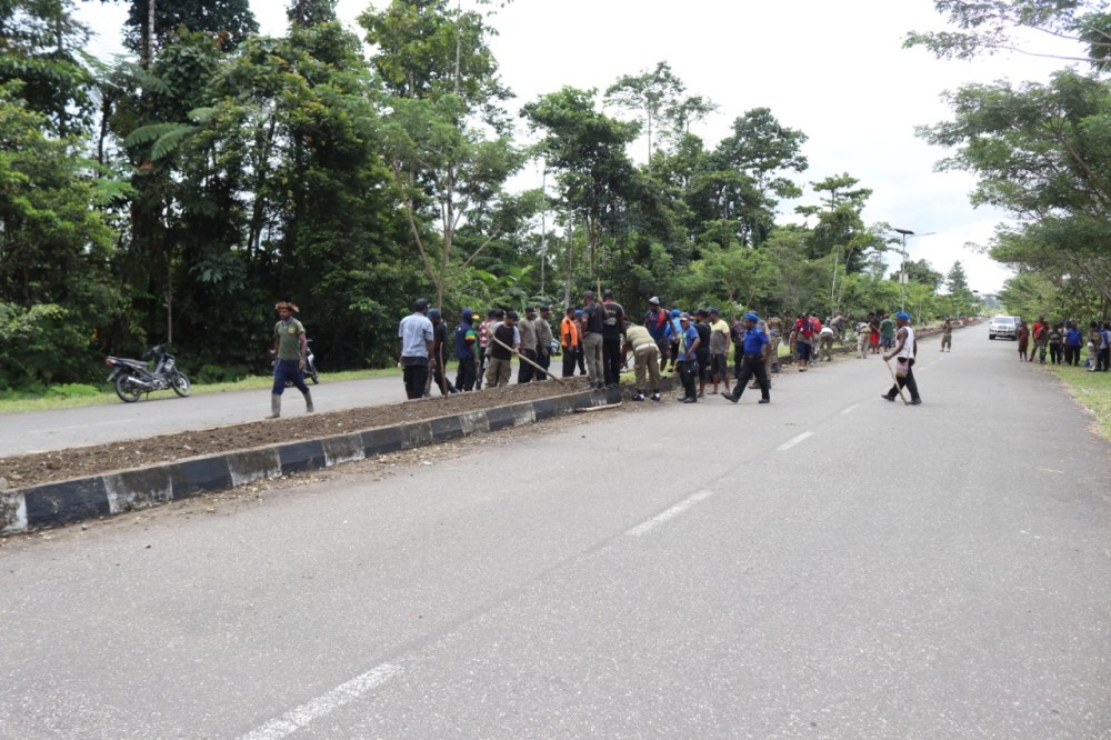 Dekai (KPN)- Pemerintah Kabupaten Yahukimo, Satuan Pamong Praja (Satpol PP) Satgas Yahukimo Bangkit dan pmk melakukan kerja bakti.