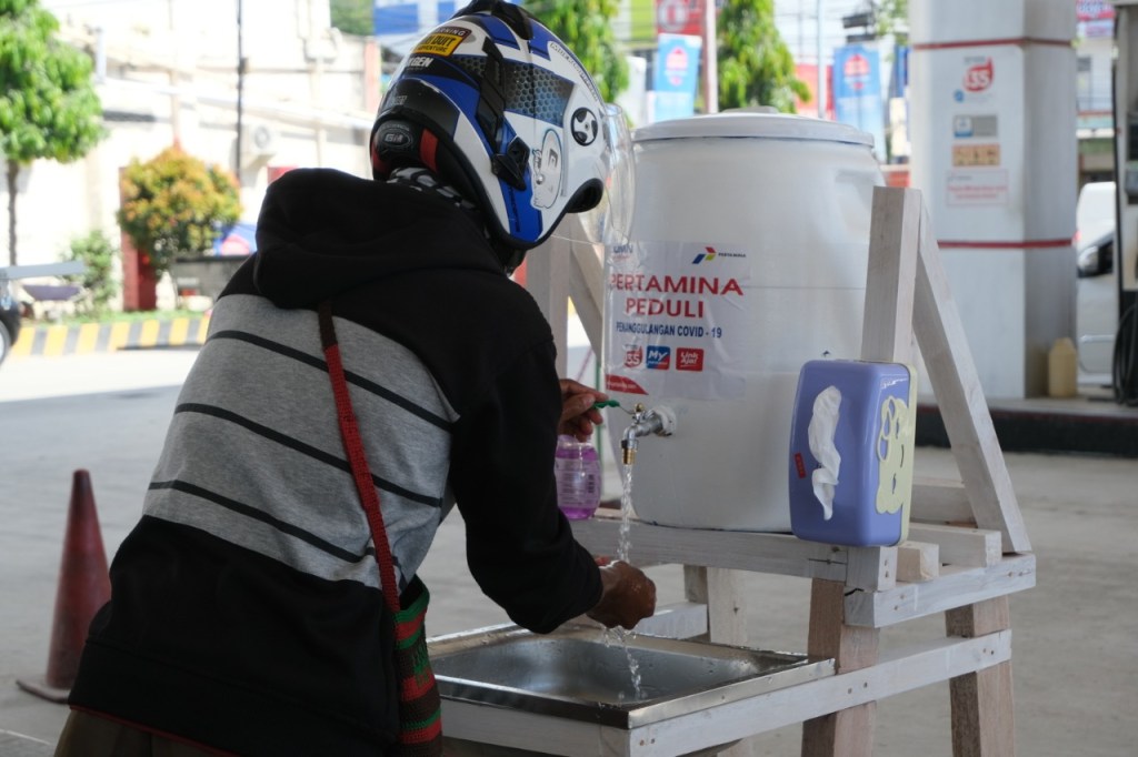 Jayapura (KPN), 27 Maret 2020 – PT Pertamina (Persero) melalui Marketing Operation Region (MOR) VIII melakukan upaya antisipasi guna mencegah penyebaran Coronavirus Disease (COVID-19) yang kian meningkat dengan penyediaan total 11 tandon cuci tangan dan melakukan penyemprotan disinfektan di area SPBU temasuk gerbang, toilet, ruang kerja serta fasilitas anjungan ATM yang tersedia di SPBU Kota Jayapura pada Jumat (27/03).