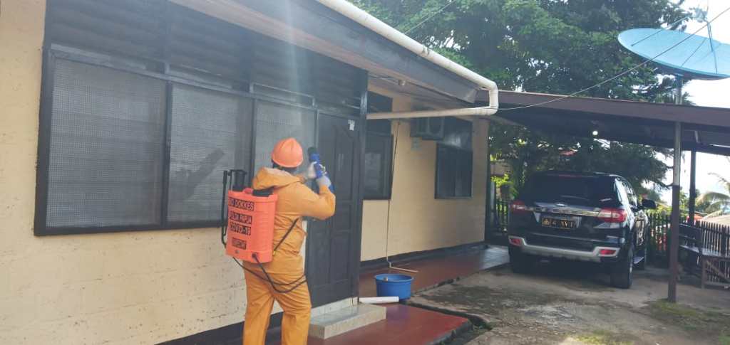 Jayapura (KPN) – Pada hari Jumat tanggal 27 Maret 2020 dimulai pada pukul 09.00 Wit, tim kesehatan Bid Dokkes Polda Papua yang dipimpin oleh AKP Didik dengan melibatkan 5 personil melakukan penyemprotan Disinfektan di rumah Dinas para Pejabat Utama Polda Papua yang berada di Angkasa.