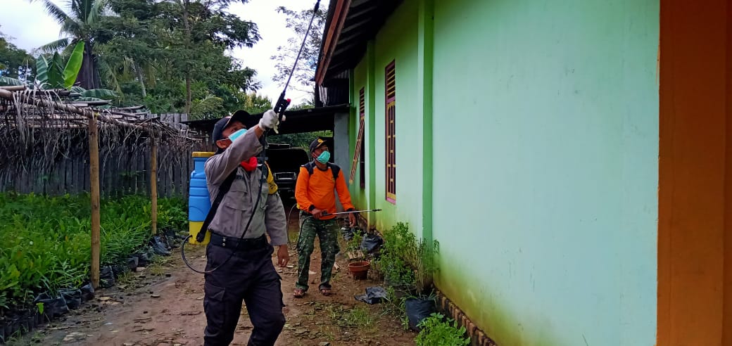 Bhabinkamtibmas Kampung Mimi Baru Bripka Mustofa bersama Babinsa dan Pemerintah Kampung Sermayam Indah dalam melaksanakan kegiatan mereka juga menyampaikan himbauan dan melakukan penyemprotan cairan Disinfectan pada Fasilitas umum, kios-kios dan rumah warga dalam rangka pencegahan penularan Covid-19.