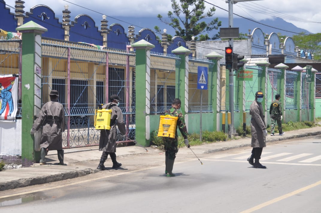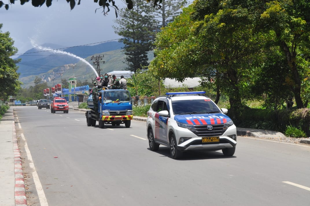 Kegiatan penyemprotan hari ketiga melibatkan dari personel TNI, Polri, Dinas Kesehatan, Perhubungan dan Damkar Kabupaten Jayawijaya.