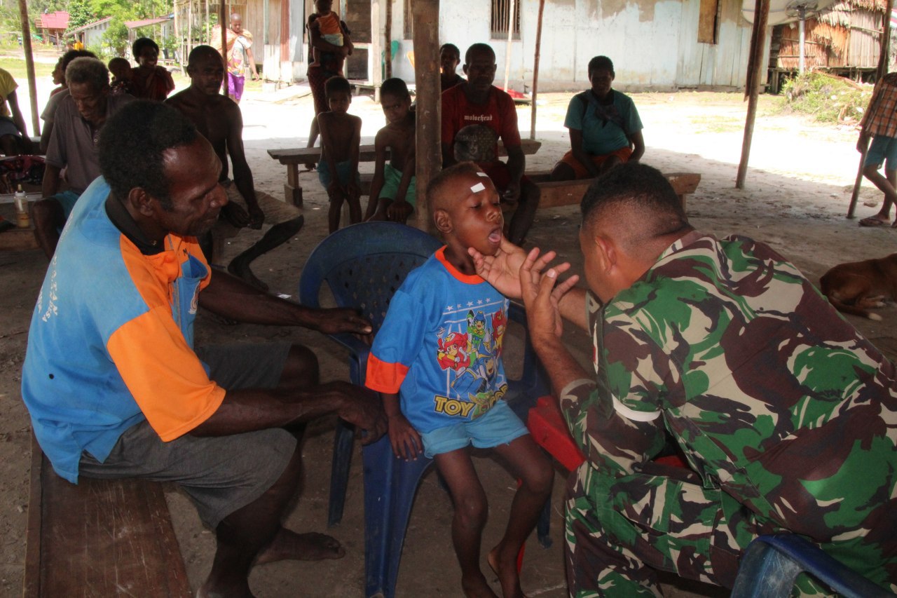 Merauke ( KPN)- Personel Satgas TMMD Ke-107 Kodim 1707/Merauke yang dipimpin langsung oleh Serka Enjels V. Steven memberikan pelayanan kesehatan secara gratis kepada masyarakat Kampung Epem, Distrik Citak Mitak, Kabupaten Mappi, pada Rabu (01/04)