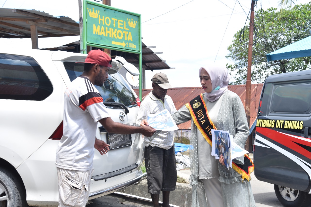 Selain memberikan himbauan, Duta Humas juga membagikan Brosur dan penempelan stiker URC terkait penanganan cepat kepada pasien yang diduga terpapar Virus corona (Covid -19).