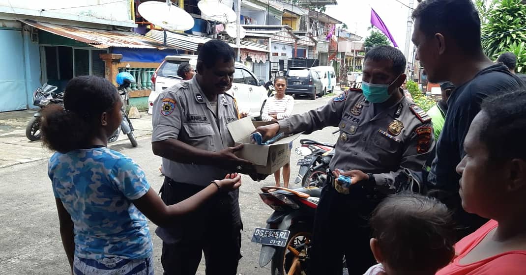 Jayapura Kota (KPN)-Dalam upaya pencegahan Covid-19 di Kota Jayapura, SatuaPadan Binmas Polresta Jayapura Kota melaksanakan pembagian masker dan sabun cuci tangan serta edukasi kepada warga masyarakat di Wilayah Distrik Jayapura Utara.hari Jumat (3/04/20)