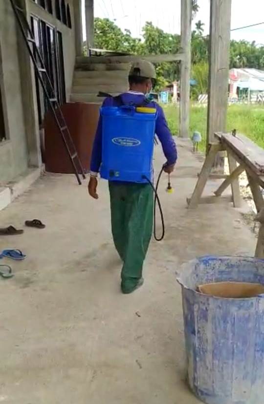 Penyemprotan Disinfektan yang dilaksanakan Bripka Muchamat Arif bersama aparat kampung, merupakan kegiatan rutin yang sudah di rencanakan 2 kali setiap minggunya. Penyemprotan dilaksanakan di tempat-tempat umum seperti Masjid, Gereja, Pasar, Kantor kampung, kios-kios dan Pos Kamling.