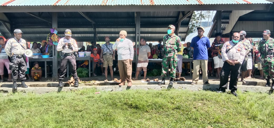 Tolikara (KPN)-Dalam upaya pencegahan dan memutuskan mata rantai Covid-19 di Tolikara, Kapolsek Bokondini IPDA Reni Kogoya Mewakili Kapolres Tolikara AKBP Leonard Akobiarek bersama kepala.Puskesmas Ola Pagawak SKM, memberikan sosialisasi di pasar mama-mama distrik.Bokondini.Selasa ( 14/04/20)