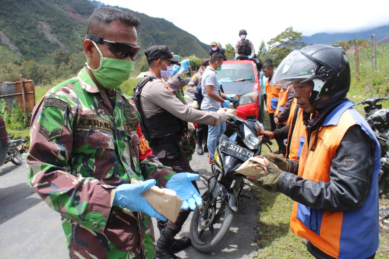 Mulia ( KPN)–Bentuk kepedulian aparat keamanan khususnya Polri-TNI terhadap para tukang ojek yang terdampak Covid-19, Polres Puncak Jaya bersama Kodim 1713 Puncak Jaya membagikan makan siang kepada seluruh tukang ojek Mulia Puncak Jaya.Pada Rabu (15/04/20).