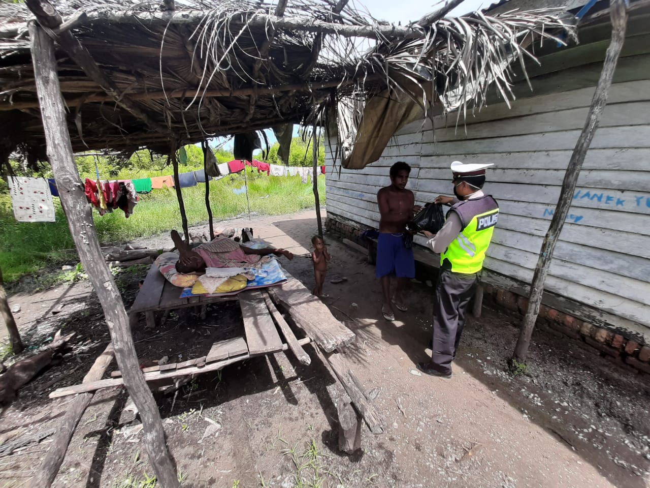 Merauke (KPN)- Satlantas Polres Merauke memberikan bantuan sosial berupa paket sembako kepada masyarakat kampung urumb di masa pandemi corona(covid-19).minggu (19/4/2020)