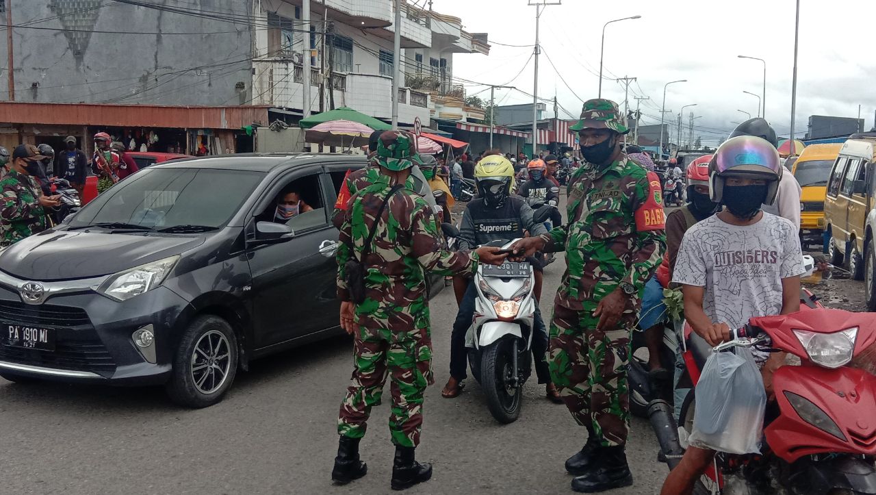 Timika ( KPN)- Untuk meningkatkan kesadaran masyarakat tentang bahaya dari virus Covid-19, TNI-Polri gencar lakukan sweeping gabungan bagi pengendara mobil dan motor yang tidak memakai masker.