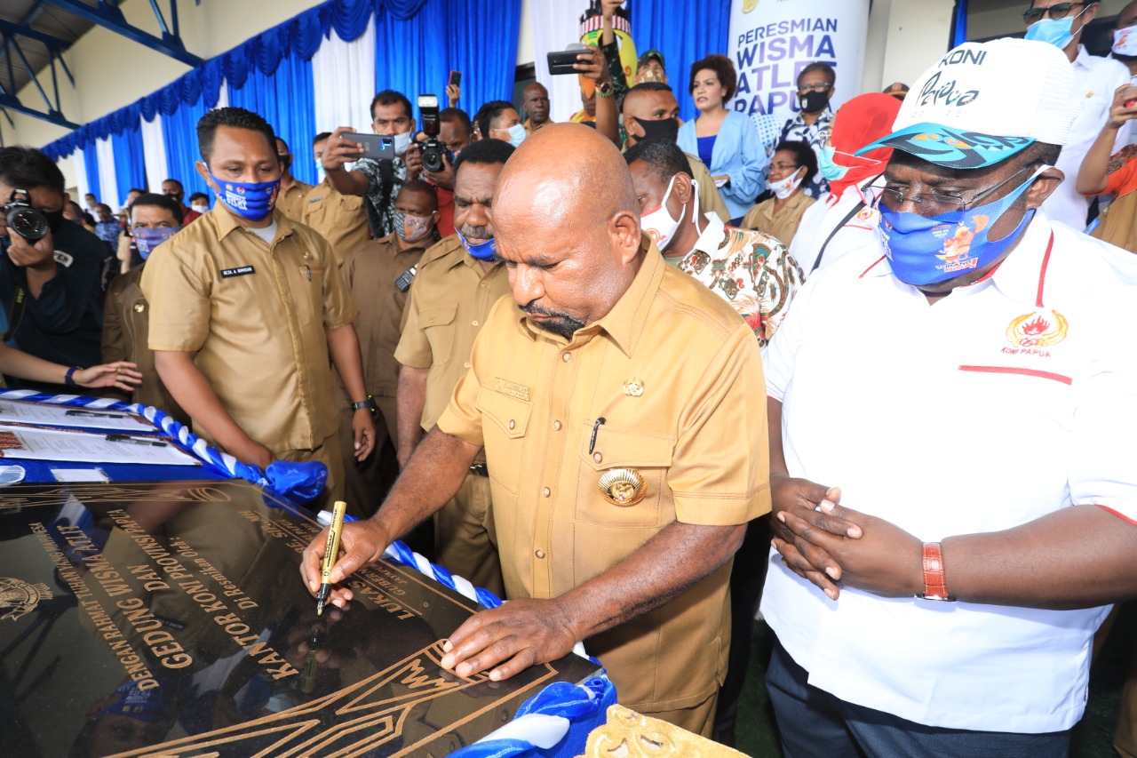 Gubernur dalam pernyataannya menegaskan Provinsi Papua kini memiliki wisma atlet dan kantor KONI yang termegah dan terlengkap fasilitasnya di Indonesia.