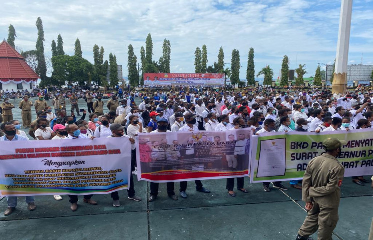 Ratusan tenaga honorer datang dengan membawa spanduk, diantaranya bertuliskan “kami 1200 honorer Provinsi Papua meminta diangkat pada formasi 2019/2020”.