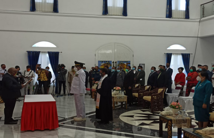 Jayapura (KPN) – Wakil Gubernur Papua Klemen Tinal resmi melantik Leonard j. Sawerdani sebagai Wakil Bupati Sarmi, Rabu (21/10/2020) di Gedung Negara Dok V Atas Jayapura, dengan sisa masa jabatan selama dua tahun.