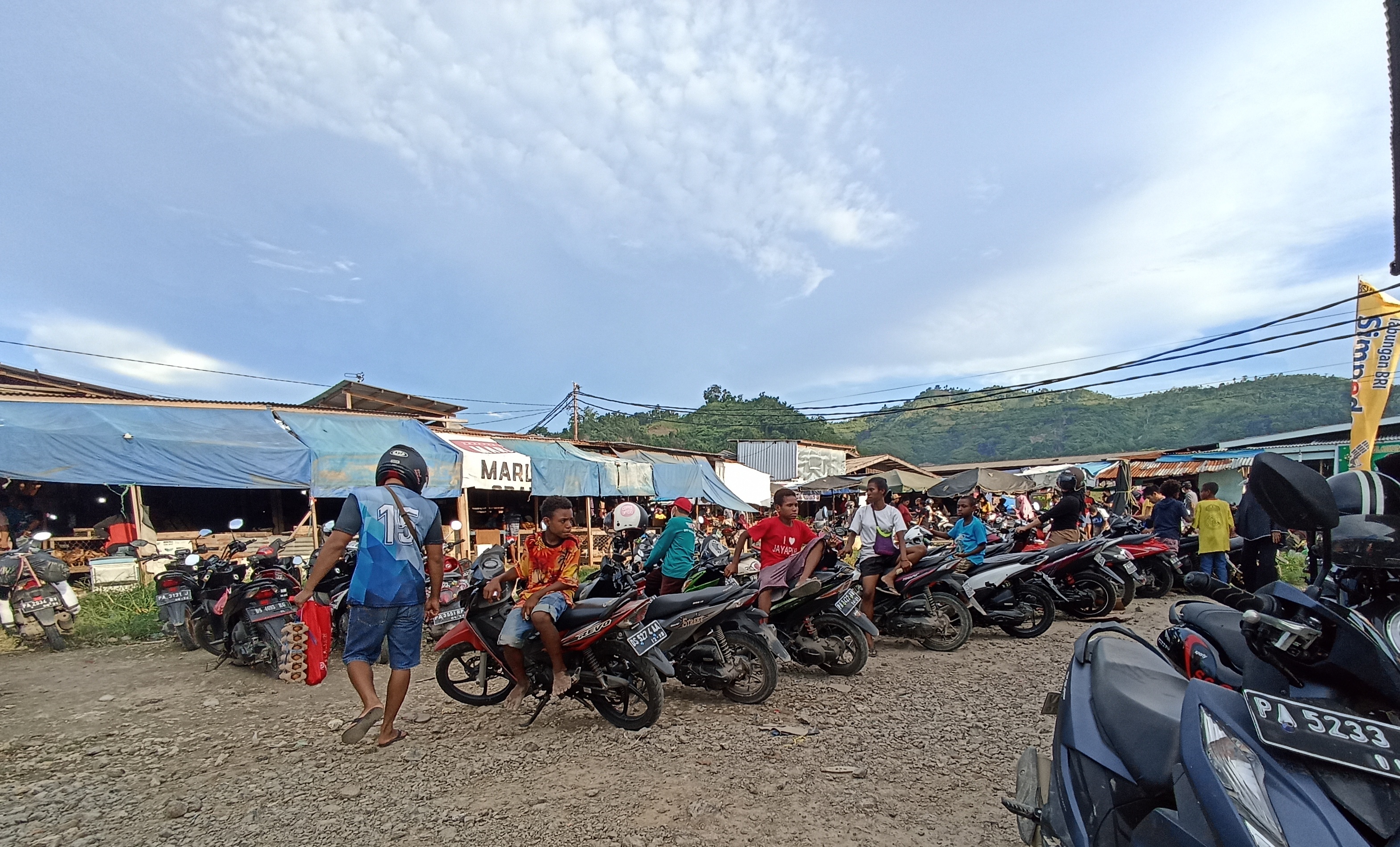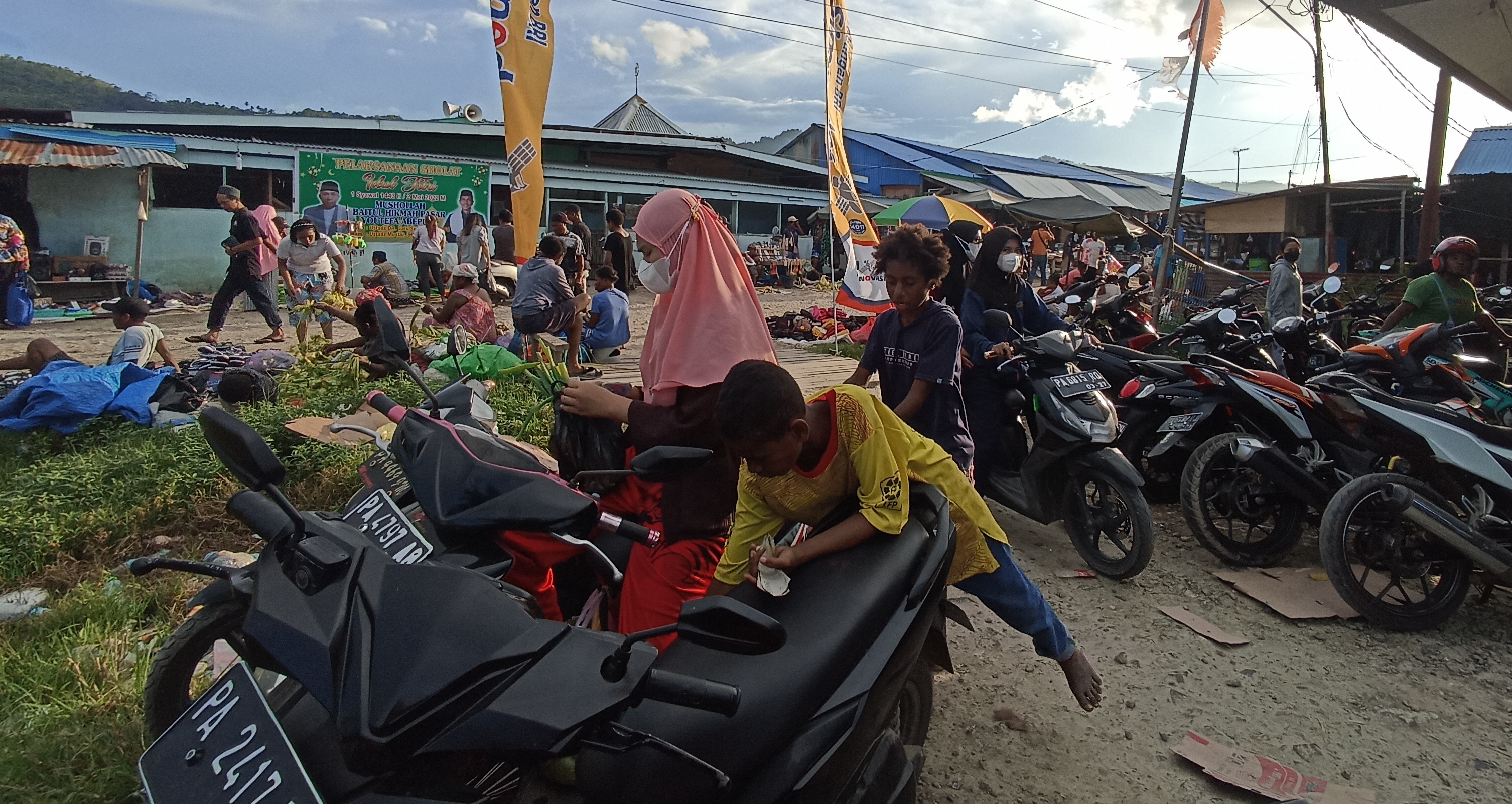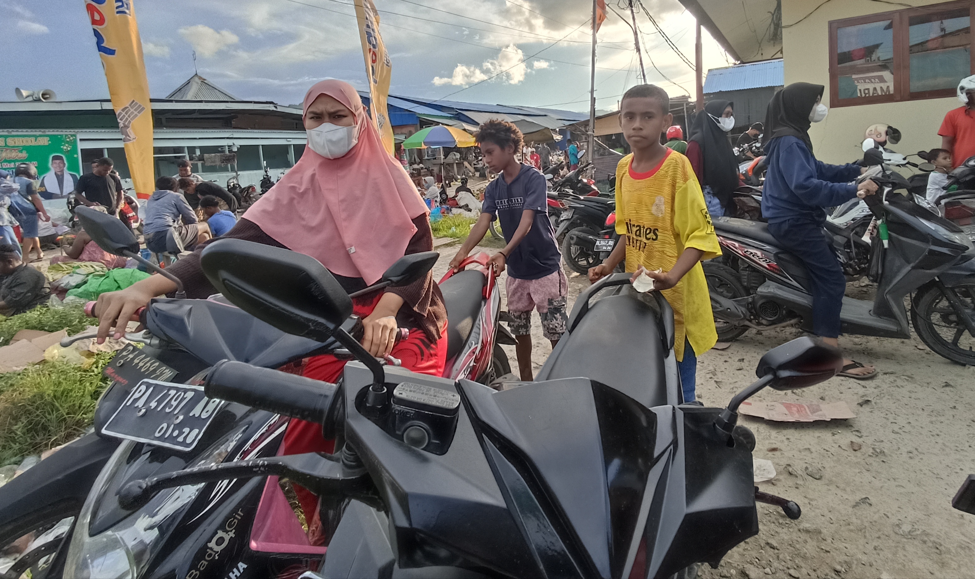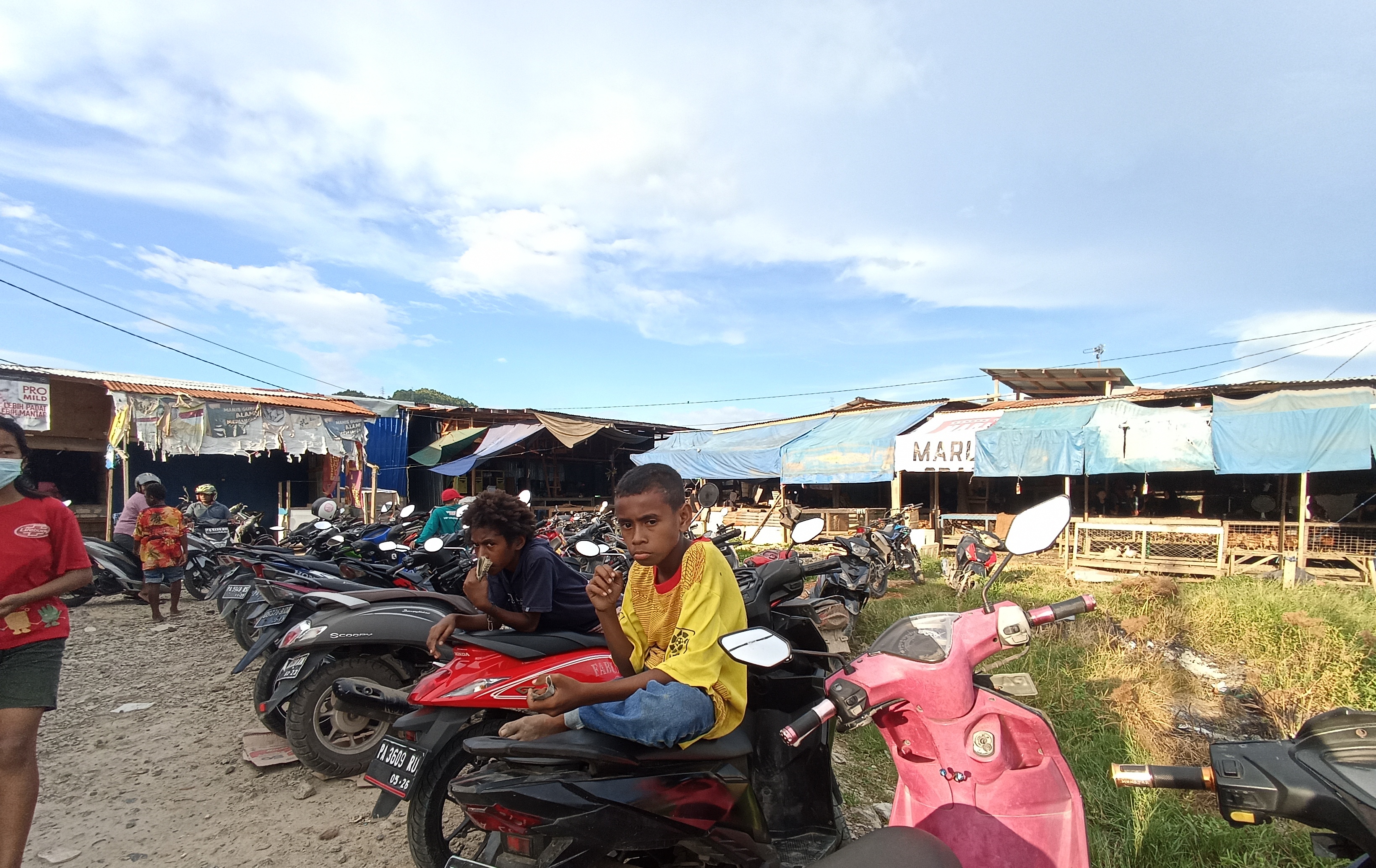 Januar dan Agus Juru parkir musiman, memanfaatkan momen lebaran untuk merauk rejeki, Minggu 1/5/22.(Foto/KPN) Agus dan Januar sedang membantu menarik motor dari tempat parkiran, Minggu 1/5/22.(Foto/KPN) Agus sedang menunggu parkiran, Minggu 1/5/22.(Foto/KPN) Suasana parkiran dipasar Youtefa, Minggu 1/5/22.(Foto/KPN)