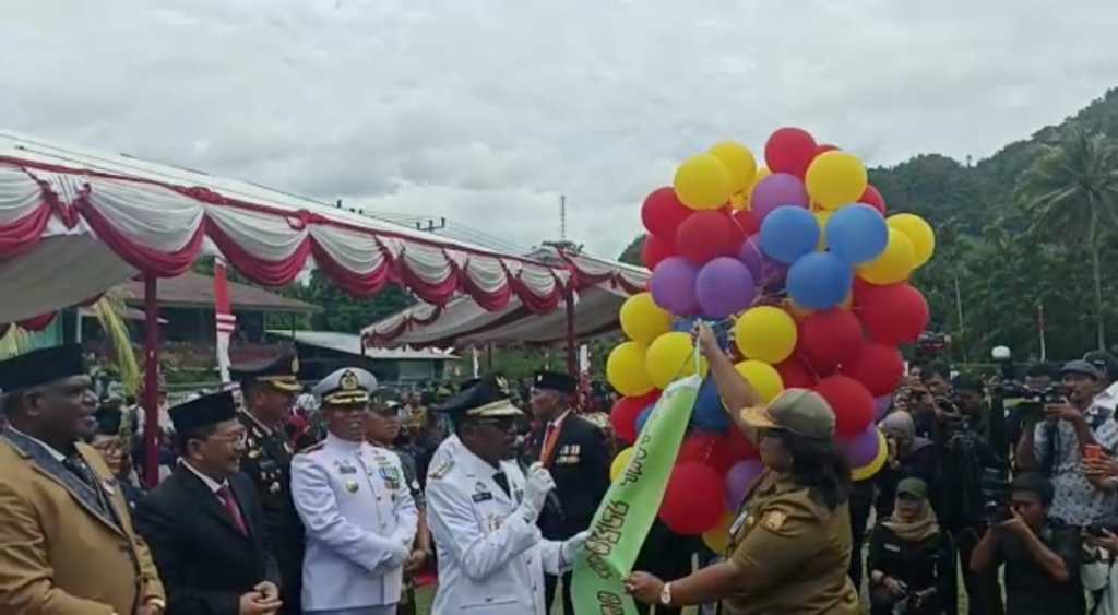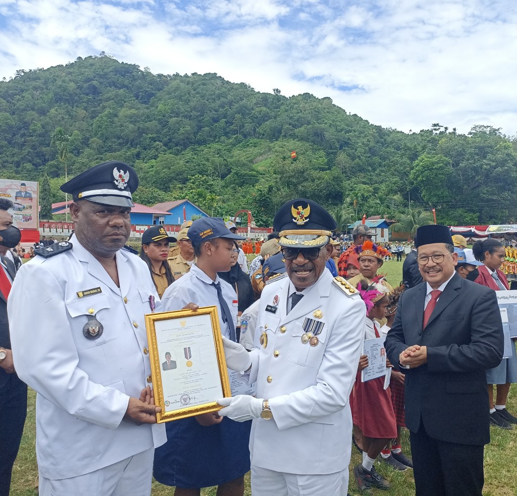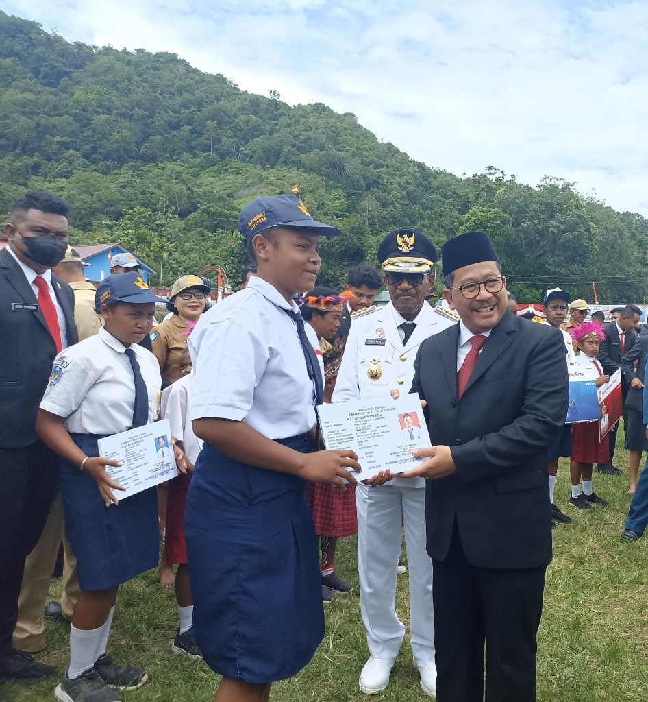 Pj. Wali Kota Jayapura Frans Pekey, Wakil Menteri Agama RI Zainut Tauhid Sa’adi, bersama Muspida, melounching Kartu Numbay Sehat dan Numbay pintar dengan melepas balon gas ke udara, momen tersebut bertepatan dengan perayaan hut ke-113 Tahun. Kota Jayapura(7/3/23), dilapangan sepak bola kampung Yoka Distrim Heram . (Dok.KPN) Ketua DPRD Kota Jayapuran, Abisay Rollo, menyerahkan secara simbolis kartu Numbay sehat kepada salah satu perwakilan anak asli Port Numvay tingkat Sekolah Dasar asal kampung Yoka. ( Dok. KPN) Wamenag RI, Zainut Tauhid Sa’adi, secara simbolis menyerahkan Kartu Numbay pintar kepada salah satu perwakikan anak asli Port Numbay. (Dok.KPN) Dalam momen Hut ke-113 Tahun 2023,kepala kampung Koya Koso Distrik Abepura, menerima penghargaan lencana desa mandiri. (Dok:KPN)