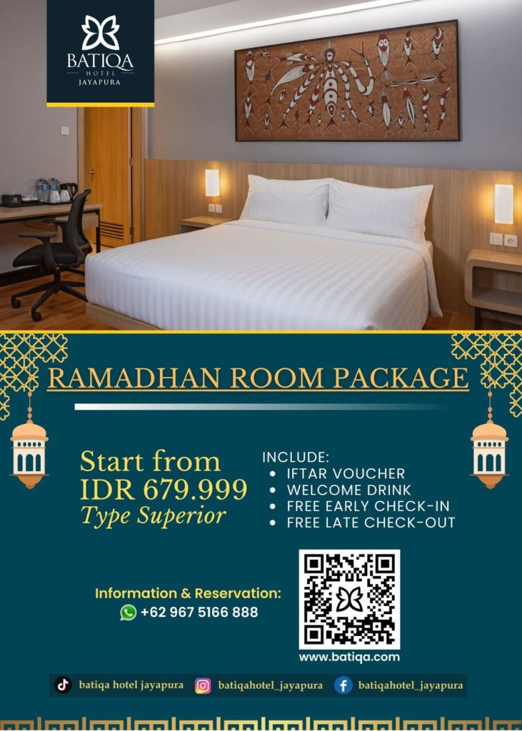 “Kami juga memberikan harga khusus untuk anggota BATIQAONE, dengan paket Kejutan Ramadan mulai dari harga Rp 594,000. Bagi yang belum mendaftar bisa langsung daftar melalui website atau link yang tertera pada Bio Instagram BATIQA Hotel Jayapura.” Lanjut Rofa Raka.