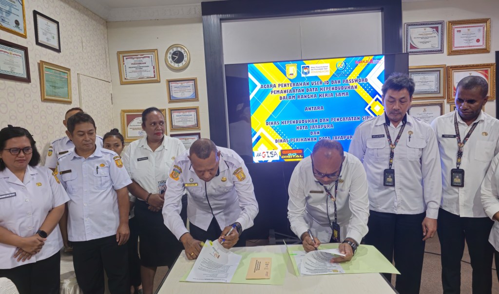 Jayapura,(KPN) – Dinas Kependudukan dan Pencatatan Sipil (Disdukcapil) Kota Jayapura bersama Dinas Perikanan Kota Jayapura resmi menandatangani berita acara penyerahan hak akses pemanfaatan data kependudukan, Rabu (09/07/2025). Penandatanganan berlangsung di ruang rapat Disdukcapil Kota Jayapura dan disaksikan oleh sejumlah pejabat dari kedua instansi.